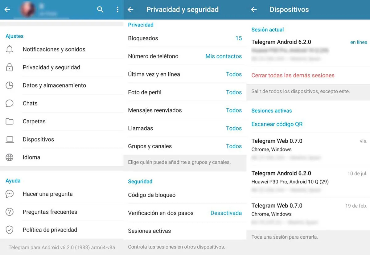 Solemos usar Telegram web para acceder a las conversaciones y chats desde el trabajo, por ejemplo. Eso implica que por error podemos dejar abierta esa sesión aunque dejemos el ordenador. En el trabajo, en la facultad, en clase. Por suerte, si tienes dudas de si lo has cerrado o no pero ya te has ido y no estás a tiempo de volver a comprobarlo, puedes eliminar las sesiones activas de forma remota. Basta con ir a la aplicación que tienes en tu móvil para comprobar qué hay abierto y cerrarlo todo, asegurándote así que nadie lee lo que no debe. Además, es recomendable que lo hagas siempre después de usar Telegram web en cualquier ordenador que no sea el tuyo personal, propio y que sólo usas tú.