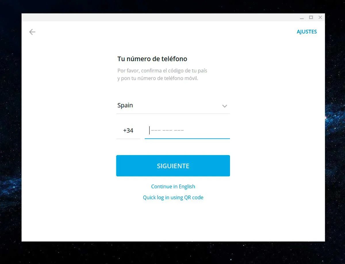 Lo único que tendrás que hacer es ir a la página de descargas de la aplicación de mensajería y elegir PC/Mac/Linux o macOS. En unos minutos se habrá descargado el programa en tu ordenador y podrás instalarlo. Tal y como ocurre en la página web, tendrás que escribir tu número de teléfono y el país en el que vives (con el correspondiente código de país de teléfono)
