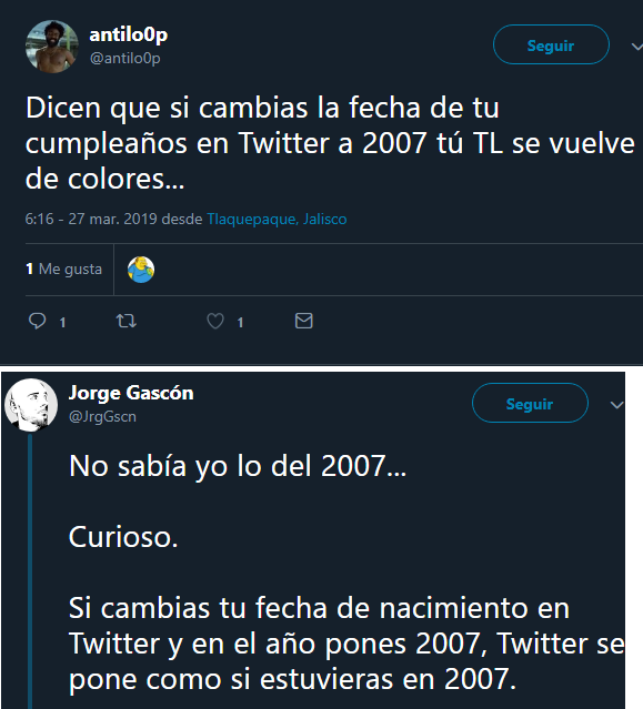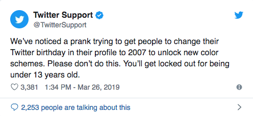 Muchos de manera inconsciente, pero otros muchos lo hacen de manera consciente porque han sido ellos, previamente los que cayeron en la broma. El método es muy sencillo, se está compartiendo un mensaje en Twitter y otras plataformas que invita a cambiar tu fecha de nacimiento al año 2007, fecha de creación de Twitter. Si realizas este cambio, tu cuenta será automáticamente bloqueada, al detectar la plataforma que no tienes los 13 años necesarios para que Twitter permita el acceso a menores de edad.