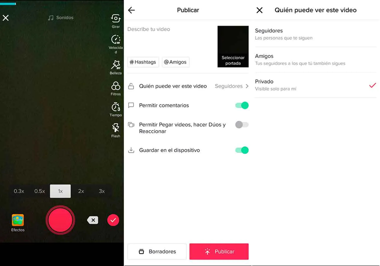 Quieres hacer vídeos en TikTok usando los efectos y las opciones de la app pero no quieres que nadie los vea… Se puede. Puedes hacerlo para posteriormente enviarlo por WhatsApp o simplemente para probar la aplicación. Solo podrás verlo o descargarlo tú.