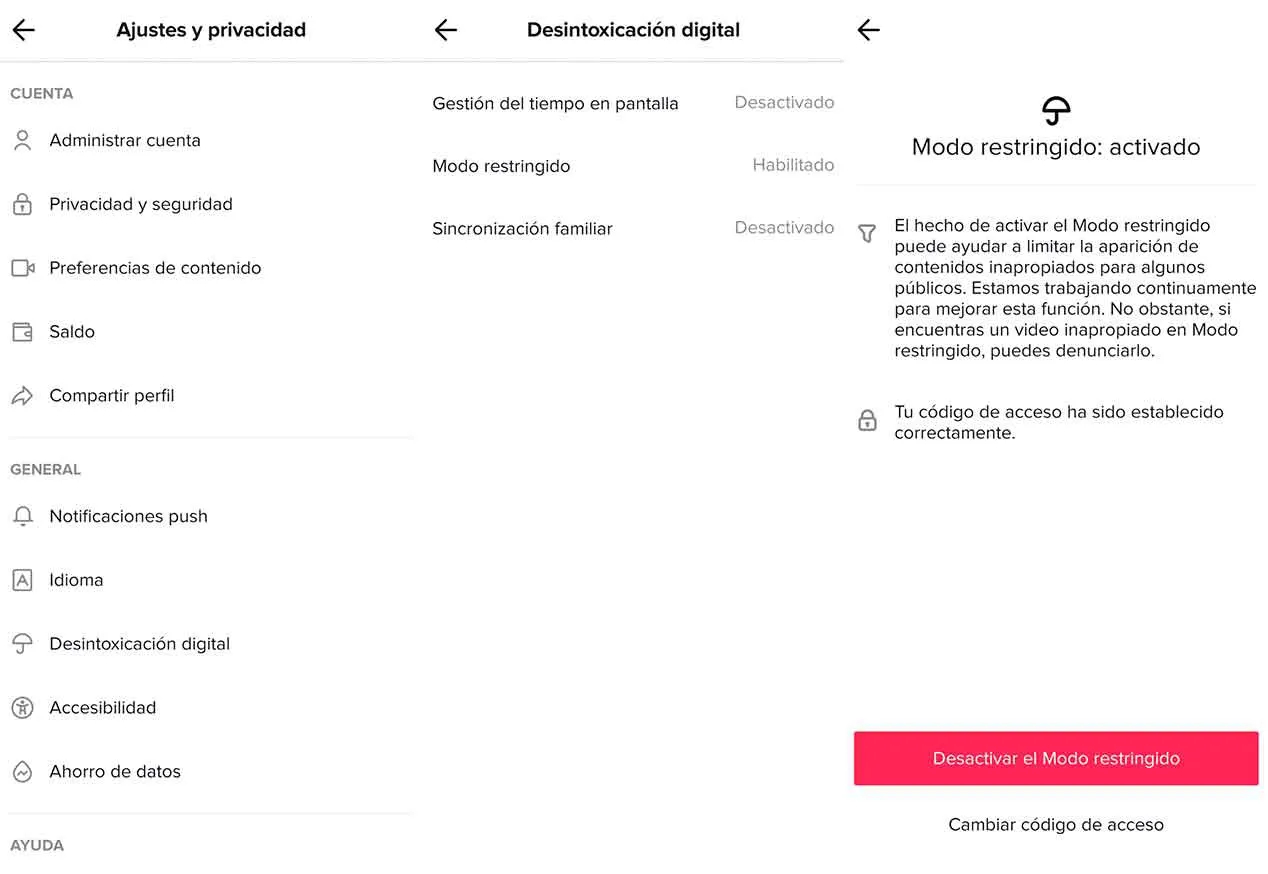 También hay un modo restringido relacionado con el uso de niños y TikTok y lo que permite es limitar los contenidos o prohibir acceso a determinadas cosas. No eliges qué ves sino que TikTok utiliza un filtro donde bloquea todo lo que considere inapropiado para todos los públicos o para adultos. También puedes activarlo desde el apartado de Desintoxicación Digital.