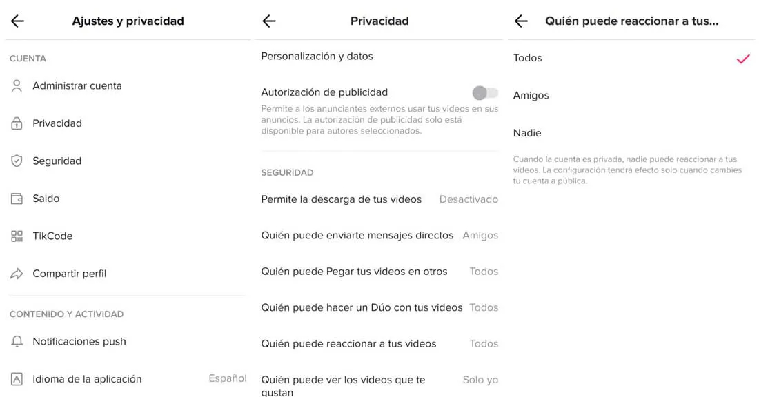• Quién puede reaccionar a tus vídeos: Todos, Amigos o Nadie