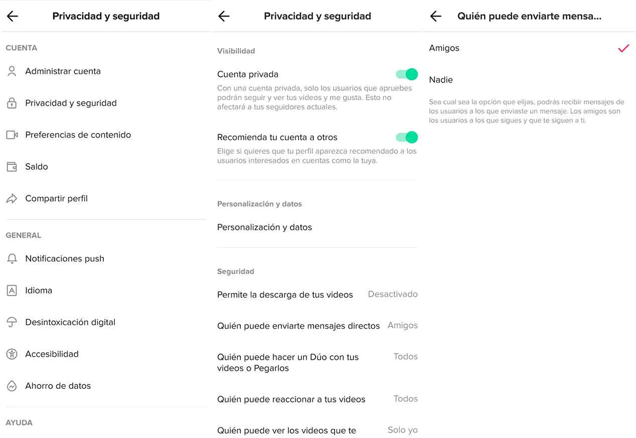 Puedes elegir otras opciones de seguridad desde este apartado: quién puede mandarte mensajes, quién pude ver los vídeos que te gustan, etc.
