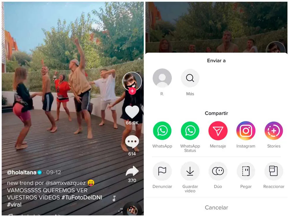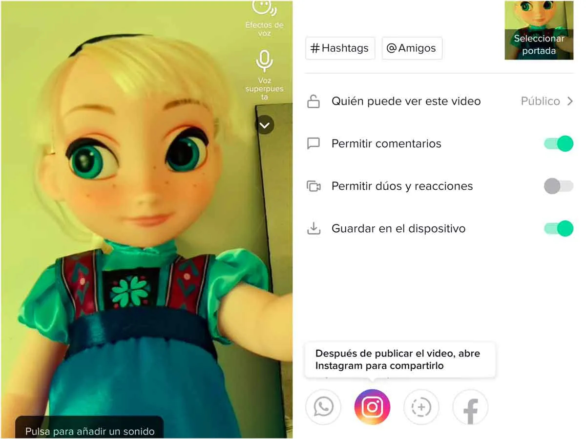 Puedes compartir los vídeos de TikTok en Instagram vinculando las dos cuentas que tengas. Así podrás encontrar un botón que directamente te permitirá compartir de una red social a otra.