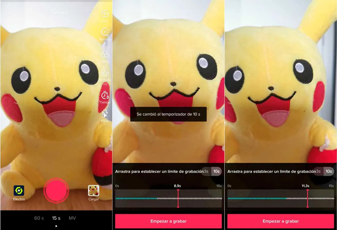 No necesitas estar sujetando el teléfono para grabar el vídeo que quieras, puedes activar un temporizador. Como otras opciones, lo encontrarás en los iconos de la parte derecha de TikTok a la hora de grabar un vídeo. Verás el apartado "Tiempo” donde puedes poner el tiempo que quieras que se grabe sin necesidad de estar tú manteniendo pulsado el botón. Eliges si quieres que empiece en 3 o en 10 segundos y luego grabará solo el tiempo que tú quieras, desde 0 segundos a 15 segundos, el máximo disponible. Tienes que repetir el proceso cada vez que grabes un clip si quieres que haya varios.