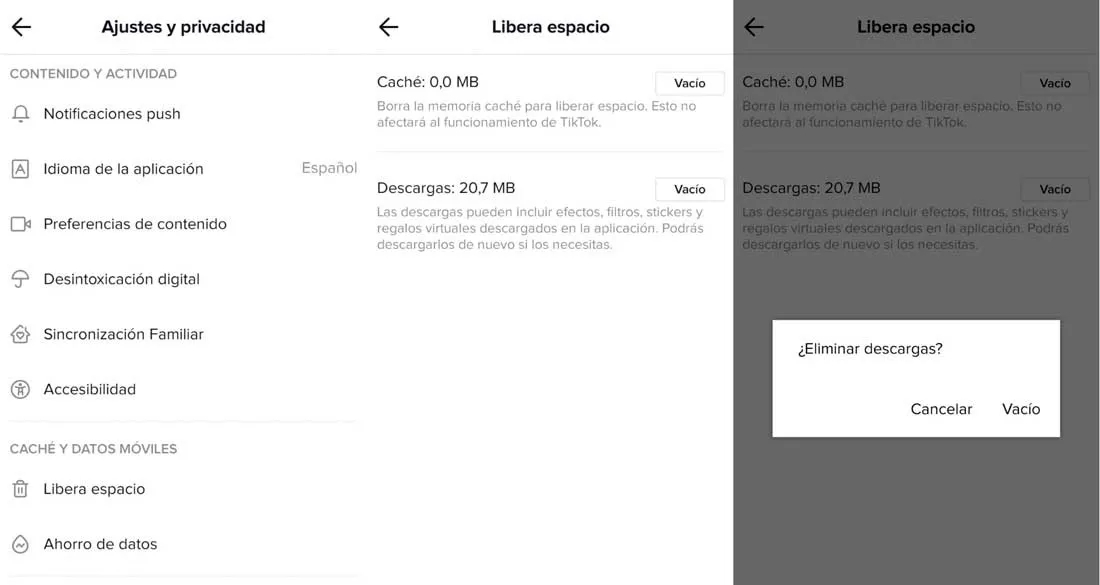 Otra de los mejores trucos para TikTok es la de ahorrar espacio que nos permite eliminar la caché temporalmente o las descargas de la aplicación como efectos, vídeos o stickers que tengas almacenadas en ella. Puedes revisarlo habitualmente y eliminar algunos megas que están ocupando hueco en tu móvil.