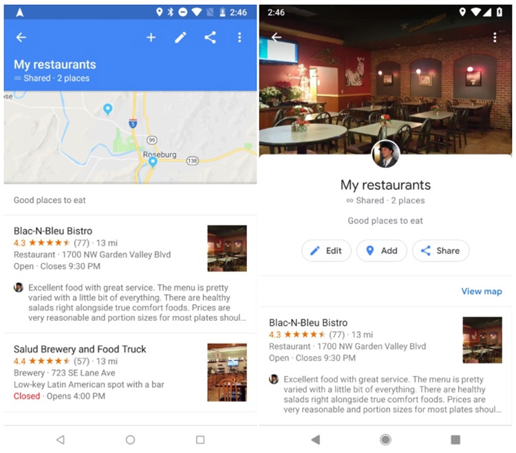 Asimismo, la disposición de los lugares agrupados en cada lista también mejora su presentación. Cada lista viene precedida de una imagen de cabecera relacionada con los sitios adjuntos. Inmediatamente después, aparecen las funciones para compartir, añadir y editar los lugares guardados. También se ofrece el acceso directo a fotos del lugar o establecimiento en cuestión de forma directa, sin tener la obligación de acceder a la ficha del punto guardado. En definitiva, un cambio estético que hace más intuitivo el apartado a la vez que potencia su funcionalidad.