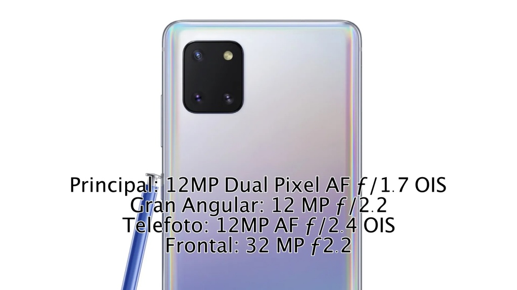 De nuevo hay tres cámaras en la parte posterior aunque configuradas de forma diferente a lo visto en el móvil anterior. En este Samsung Galaxy Note 10 Lite tenemos un sensor principal de 12 MP fDual Pixel con apertura f/1.7 y OIS, seguido de un gran angular de 12 MP y apertura f/2.2 y un teleobjetivo de 12 MP con apertura f/2.4.foto4