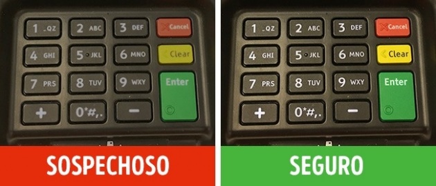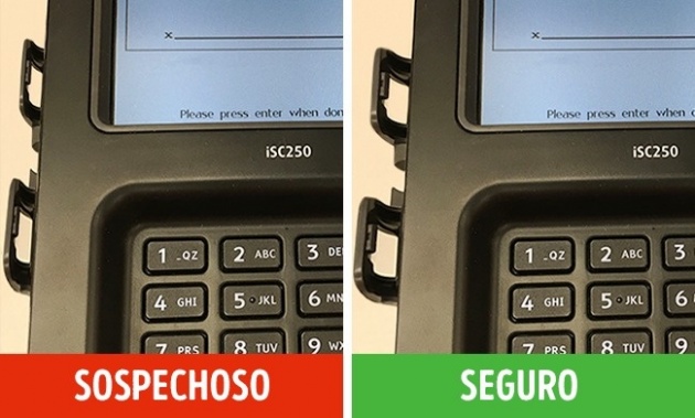 Para que el panel de skimmer pueda acoplarse al terminal, debe ser más largo y más ancho que el dispositivo. Es por eso que el terminal con un skimmer es de tamaño visiblemente más grande que el terminal original. Esta es la característica principal para identificar un skimmer.