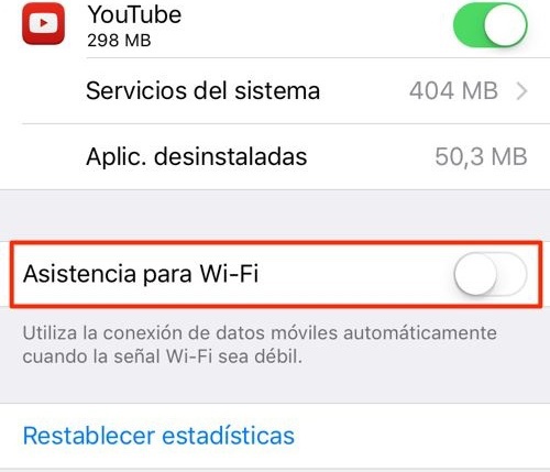 Lo primero de todo, si quieres ahorrar datos en iPhone, es desactivar Wi-Fi Assist en el móvil. Este sistema hace que el teléfono, cuando esté conectado a una red Wi-Fi de baja intensidad, automáticamente se desconectará de la misma para pasar a usar la red de datos, pudiendo ocasionar un gran desgaste de los mismos. PAra deshabilitar esta opción todo lo que tienes que hacer es acceder a la configuración del móvil y entrar en el menú de Datos Móviles. En la parte inferior deberás marcar la opción para anular la función.