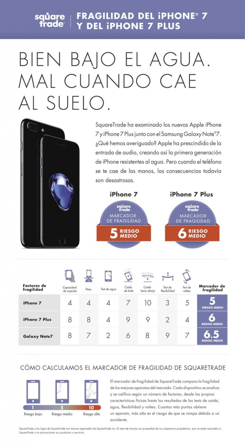 Ya lo venimos diciendo hace varios días, todos los focos apuntan ahora al iPhone 7, desde su presentación hace un par de semanas se ha convertido en el protagonista absoluto de la actualidad, y como tal está pasando por numerosas pruebas que miden su resistencia y calidad de fabricación. En esta ocasión nos hacemos eco de la prueba de los expertos de Square Trade, que han medido entre otras cosas la resistencia al agua real del nuevo iPhone y el iPhone 7 Plus, siendo comparada con la de su principal rival, el Samsung Galaxy Note 7.