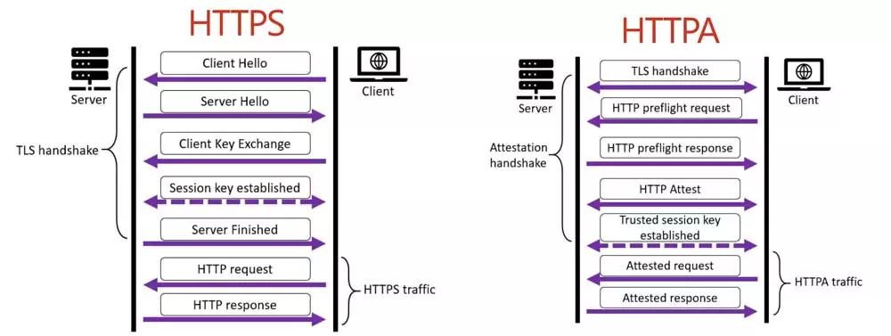 HTTPA requiere una extensión del proceso de handshake entre las dos partes. Para ello, utiliza tres fases: solicitud y respuesta de verificación previa HTTP; solicitud y respuesta de atestación HTTP; y solicitud y respuesta de sesión de confianza HTTP. El primero comprueba si el servidor acepta HTTPA, y el resto ya se encargan de la verificación y la solicitud de envío de información.