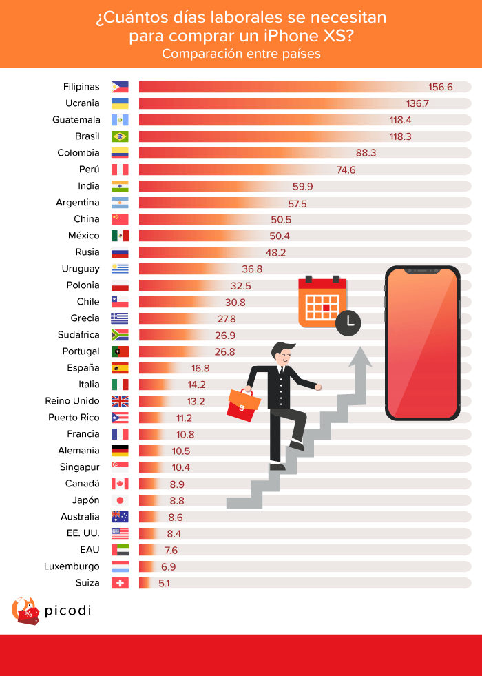 El Departamento de Análisis de Picodi decidió estudiar cuántos días los guatemaltecos, los puertorriqueños, los mexicanos y los ciudadanos de otros países, tienen que trabajar para poder comprar el último smartphone de Apple. Los resultados de este estudio están basados en los precios del iPhone XS 64 Gb en 63 países y en los datos oficiales de los salarios promedio en cada uno de ellos.