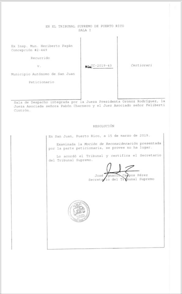 Aunque ya el tribunal Supremo había ordenado la restitución del inspector Heriberto Pagán, quien fuera expulsado por un vacilón en "WhatsApp” en su tiempo libre, la alcaldesa se había negado a la restitución de este y continuaba gastando dinero de los ciudadanos de San Juan sometiendo reconsideraciones, por medio de abogados afiliados al partido popular.