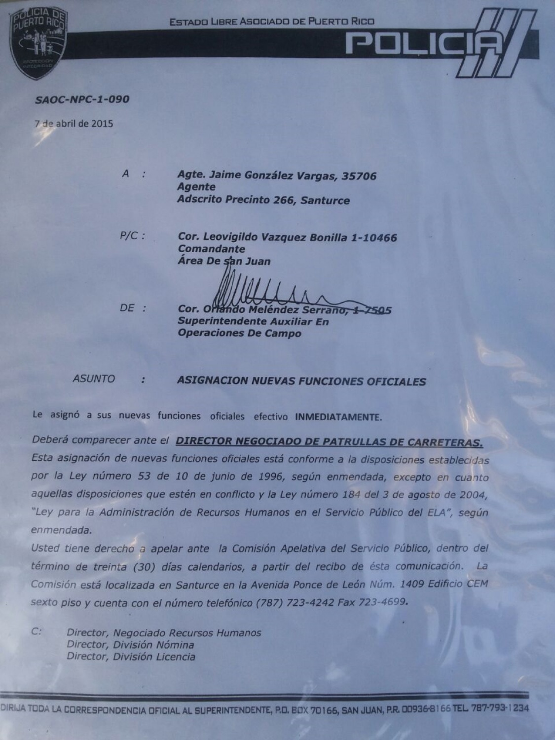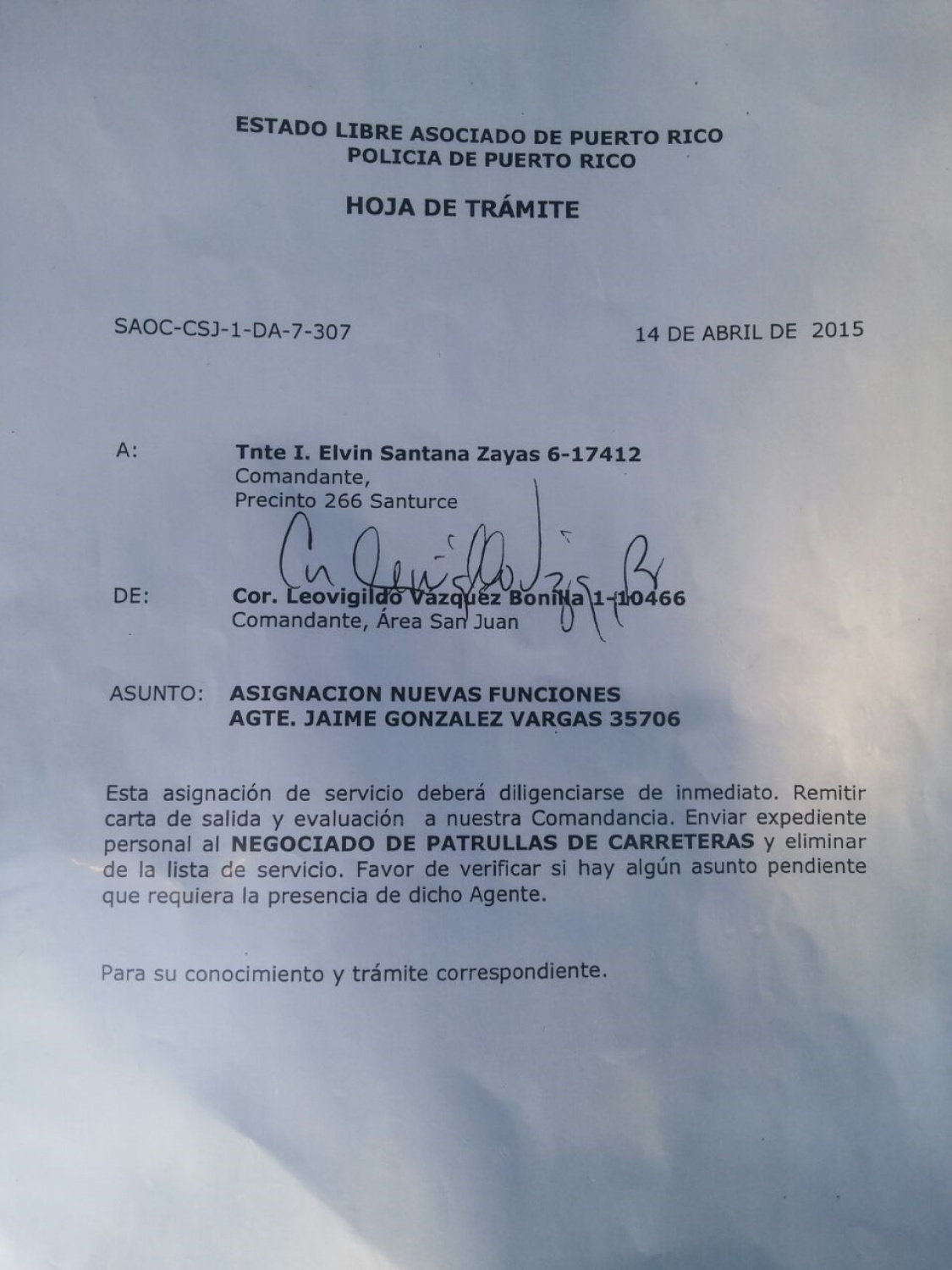 Un documento en poder de Tu Noticia PR confirma la asignación de del agente Jaime González el pasado 7 de Abril al negociado de patrulla de carreteras, según fuera solicitado por este, González seria uno de los policías a los que se le asignaría una de las nuevas 100 motoras "Harley-Davidson" recientemente entregadas por el gobernador a la policía. El día antes de la entrega González fue notificado verbalmente por el coronel Bermúdez que no se le concedería el traslado solicitado por el y aprobado en la superintendencia de operaciones de Campo "No te podemos asignar una motora nueva por el revolú que tienes con Sagardia" alegan fueron las palabras de Bermúdez y de esta forma el agente fue descartado de una posición que según muchos es privilegiada.