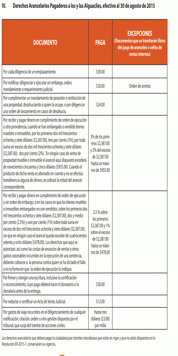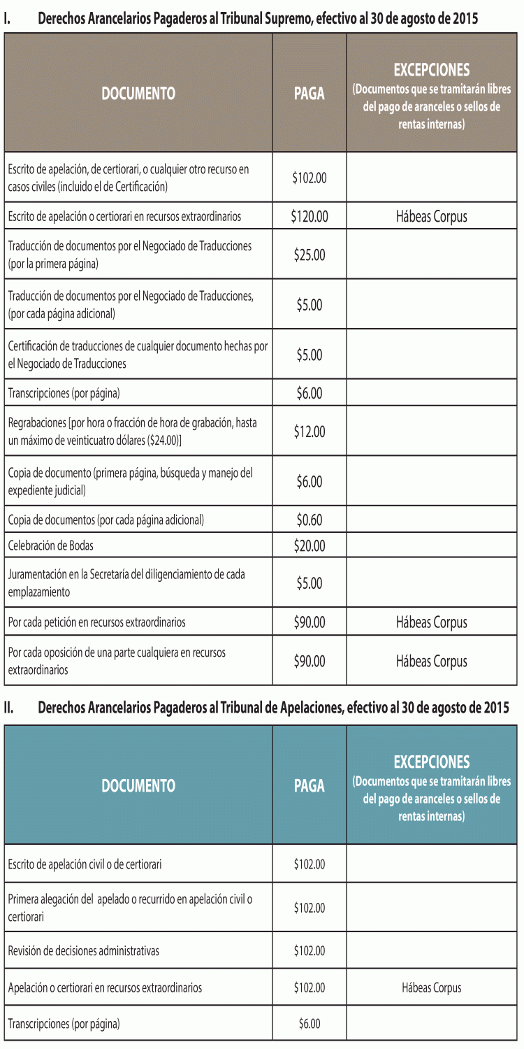 El Tribunal Supremo de Puerto Rico aprobó mediante su Resolución ER-2015-1 del 9 de marzo de 2015 una nueva estructura arancelaria para la tramitación de acciones civiles ante el Tribunal de Primera Instancia, el Tribunal de Apelaciones y ante el Tribunal Supremo, en atención a lo dispuesto en la Ley Núm. 47-2009, según enmendada.