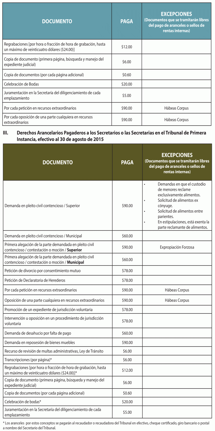 La nueva estructura arancelaria entra en vigor el 30 de agosto de 2015. Se mantiene vigente el sistema de un pago único al momento de la presentación de la primera comparecencia de la(s) parte(s) ante el Tribunal así como todas las excepciones reconocidas anteriormente.