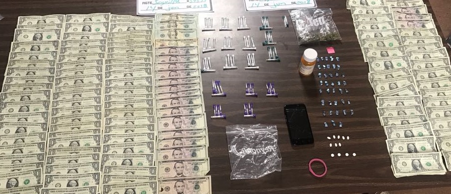 Según el agente Néstor Espinosa, se arrestó a Rafael Rivera Guzmán, de 28 años y Gabriel Rosario Benítez, de 24 años, ambos residentes en Fajardo, a los que se le ocupó 87 cápsulas de crack, 28 decks de heroína, una bolsa de marihuana, una bolsa de cocaína, 12 pastillas de medicamentos controlados y $286.00 dólares en efectivo.