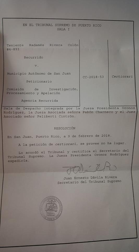 El municipio solicitó un recuerdo de certiorari al que el Tribunal dio "No a lugar”, por lo que el municipio tendrá que pagarle lo dejado de devengar al teniente; bueno, los ciudadanos en San Juan.