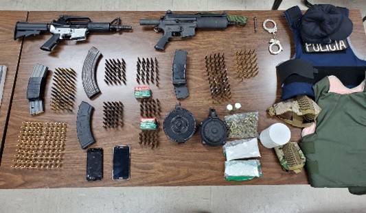 En el operativo, se ocuparon dos rifles; seis cargadores de rifle; dos cargadores de tambor y sobre 300 municiones de diferentes calibres, además de envases y bolsas de sustancias controladas, tres máscaras y dos chalecos antibalas.
