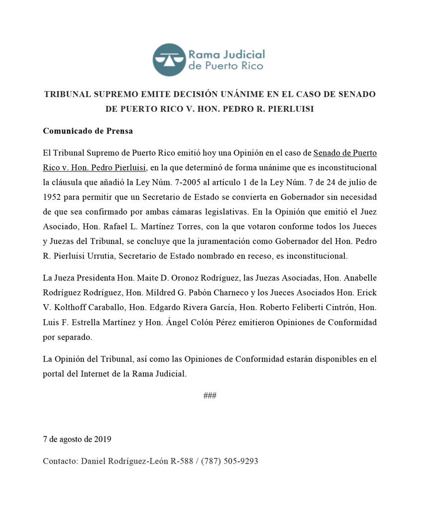 El Tribunal Supremo de Puerto Rico emitió el miércoles, una Opinión en el caso de Senado de Puerto Rico v. Pedro Pierluisi, en la que determinó de forma unánime que es inconstitucional la cláusula que añadió la Ley Número 7-2005 al artículo 1 de la Ley Número 7 de 24 de julio de 1952 para permitir que un Secretario de Estado se convierta en Gobernador sin necesidad de que sea confirmado por ambas cámaras legislativas.