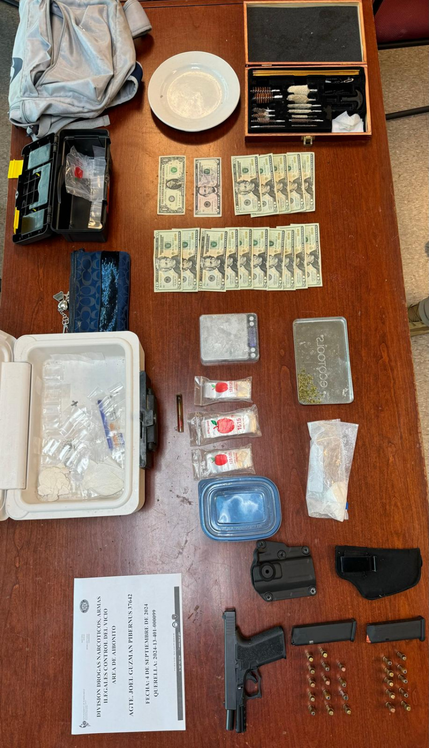 Agentes del Negociado de la Policía, adscritos a la División de Drogas de Aibonito, ocuparon en el lugar una pistola Glock 23, dos cargadores, 24 municiones, cocaína, marihuana, parafernalia y $306 en efectivo.