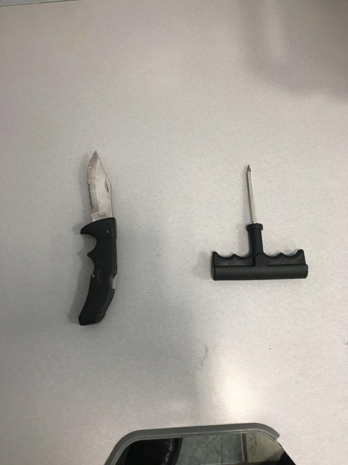 De la investigación se desprende que ambos sujetos la emprendieron ayer contra un vehículo compacto de la red de transporte Uber, en las inmediaciones del Restaurante Metropol ubicado en Isla Verde, Carolina. Al momento pesa un cargo a cada individuo por infringir el Artículo 198 del Código Penal por causar daño a la propiedad y un cargo por el Artículo 5.05 por utilización de arma blanca. En el lugar fueron ocupados una cuchilla y un punzón, con los que presuntamente causaron daños a los neumáticos del vehículo.