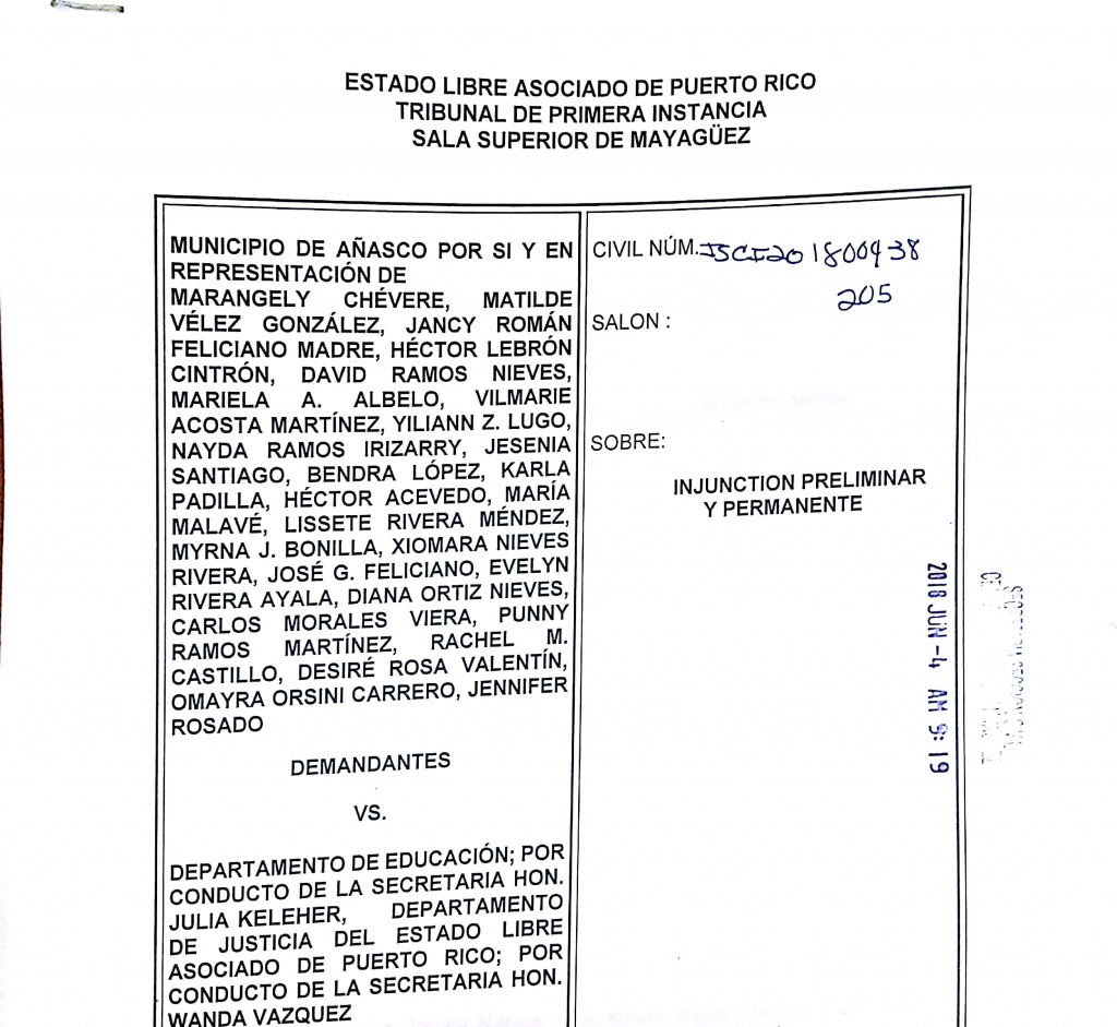 El interdicto preliminar fue radicado en la mañana del lunes, 4 de junio en la Secretaría del Tribunal Superior en la ciudad de Mayagüez por los abogados del municipio de Añasco, encabezados por la licenciada María del Carmen Gitany.