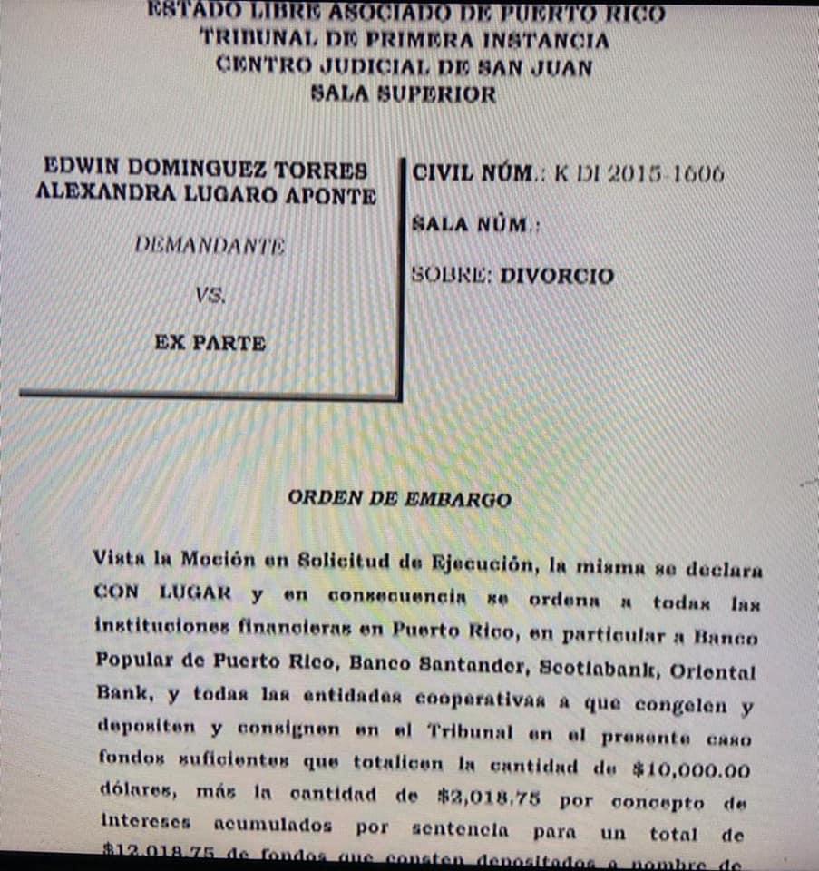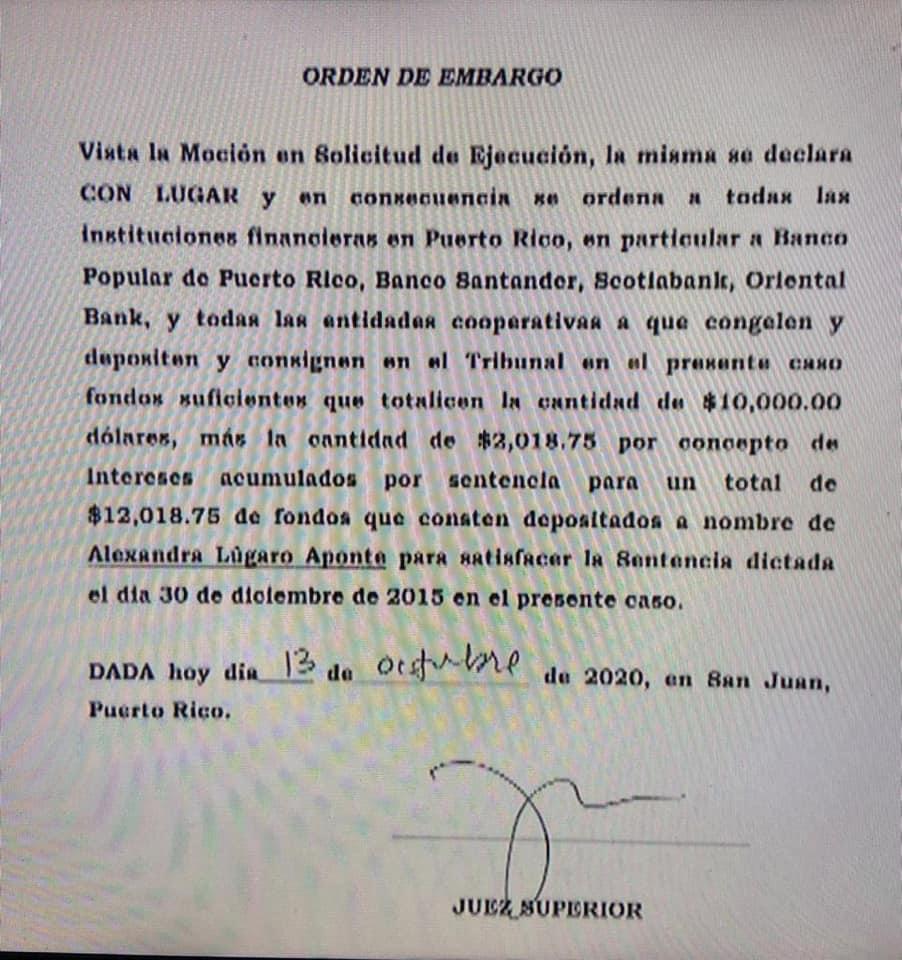 Durante el día de hoy en el programa "La Comay” fue presentada una alegada orden de embargo contra las cuentas bancarias de a la candidata a la gobernación Alexandra Lúgaro Aponte.