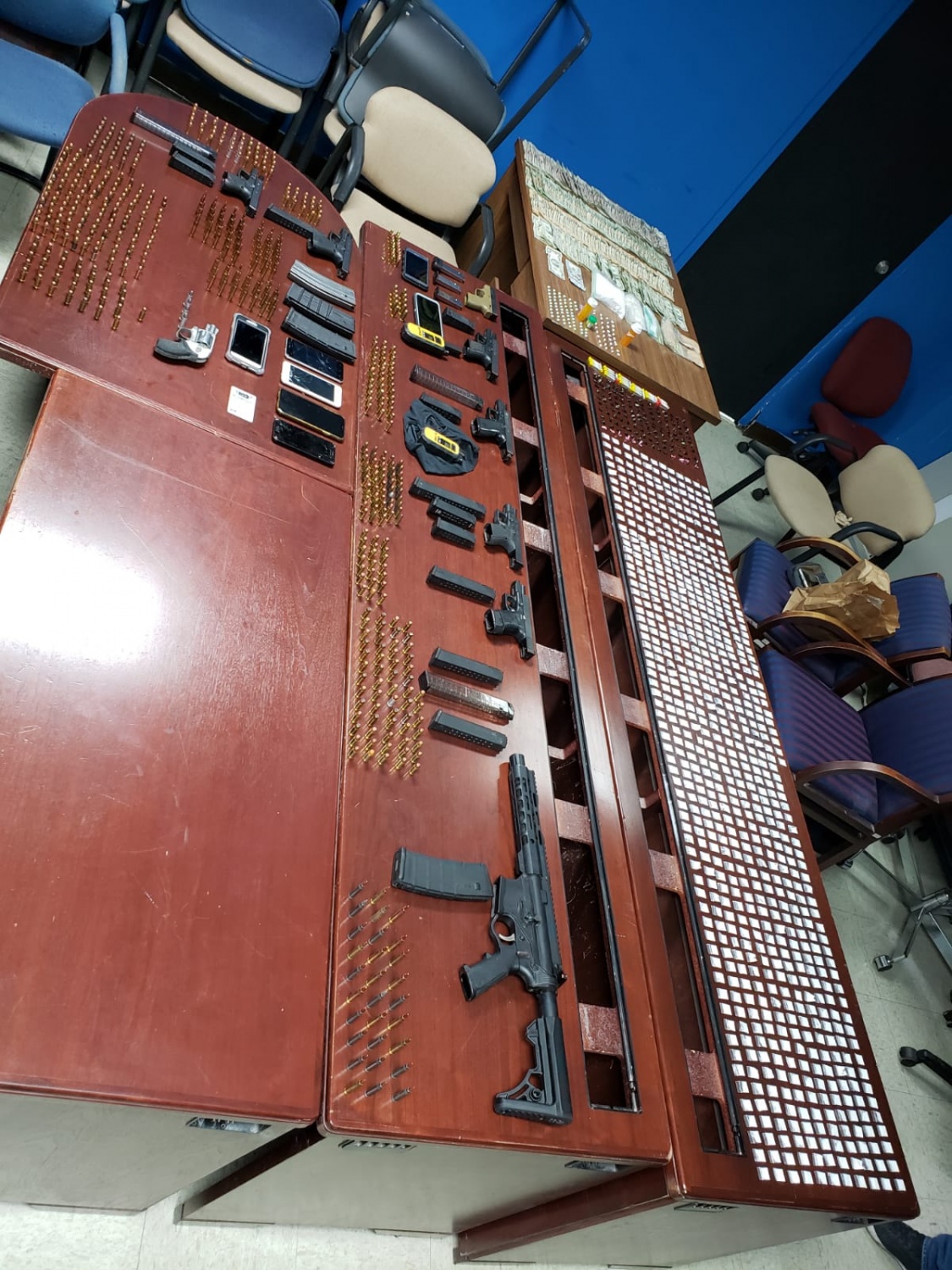 Surge de la investigación, que mientras los agentes diligenciaban una orden de arresto por violaciones a la Ley 54, arrestaron a cuatro individuos a los cuales le ocuparon: (1) rifle AR15, cuatro (4) pistolas Glock .40, una (1) pistola Glock .45, una (1) pistola Glock 9mm, una (1) pistola Beretta 9mm, 23 cargadores, un (1) revólver .38, 95 municiones calibre 223, 224 municiones calibre .40, 10 municiones calibre .45, 211 municiones 9mm, cuatro (4) municiones calibre .38, 35 municiones calibre 357, $3,006 en efectivo, ocho (8) teléfonos celulares, dos (2) radios comunicaciones, 747 bolsas de cocaína, 29 cápsulas de crack y 146 decks de heroína.
