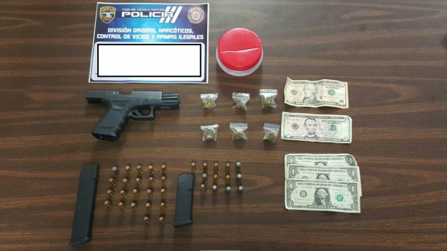 El agente Ismael Feliciano Mercado, arrestó a un hombre identificado como Shamale Carradero Peralta, de 27 años, residente en Luquillo y Henry Sánchez Cheverez, de 26 años, residente en Fajardo, a estos se les ocupó: una pistola marca Glock modelo 23 calibre .40 con dos cargadores, 35 municiones, seis bolsas de marihuana y $ 18.00 dólares en efectivo.